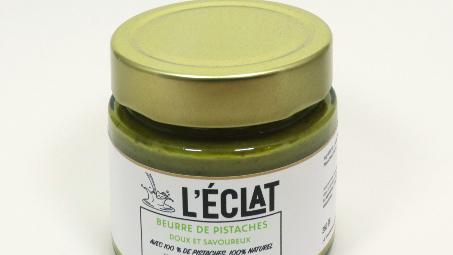 Onctueux et très doux, notre beurre de pistaches est confectionné de pistaches d’une variété reconnue pour sa douceur et son goût. La production biologique et la richesse des sols donnent à la pistache un goût unique, une couleur harmonieuse et surtout une texture idéale !