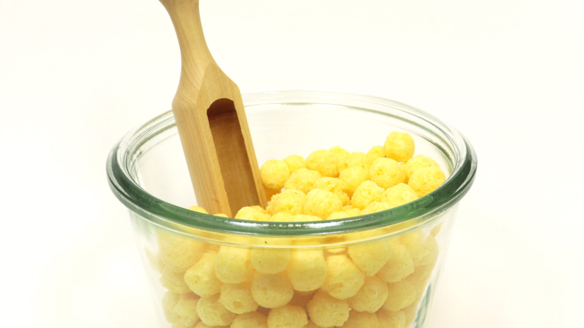 La bille de maïs est obtenue par cuisson-extrusion d’un mélange composé majoritairement de semoule de maïs. La cuisson-extrusion est un traitement mécanique et thermique simultané puis le produit est extrudé grâce à la force de pression vers l’extérieur. Après séchage/toastage, le produit acquiert une texture croustillante et une couleur jaune pâle. Ces billes sont ensuite enrobées d’un sirop de sucre au miel.