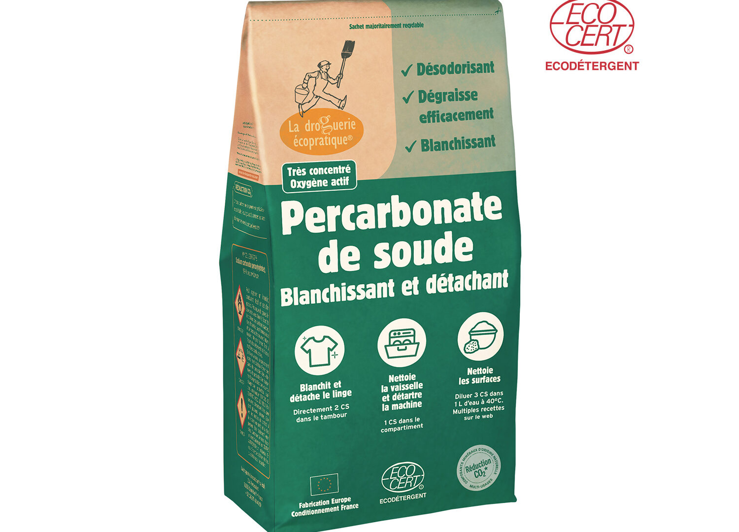 Nettoyant et dégraissant puissant, le percarbonate est aussi un produit d’entretien multi-usages. Sans chlore ni azurant optique, il est fabriqué à partir de de matières premières : eau, sel, craie.