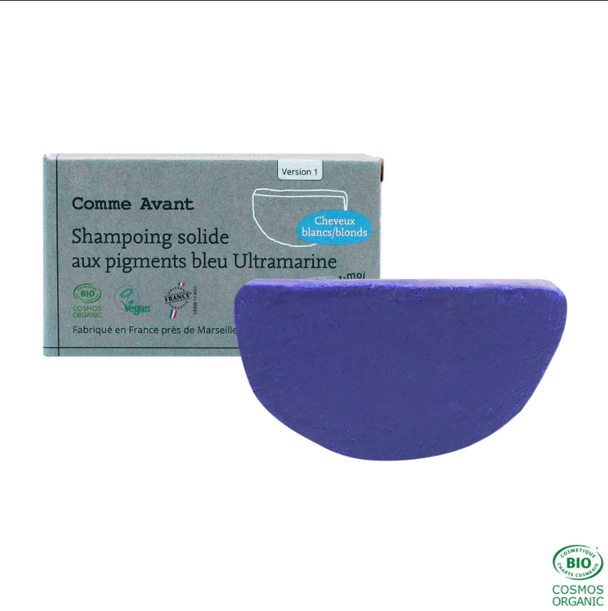 Le shampoing naturel et solide aux pigments bleu ultramarine est destiné aux cheveux blonds à blancs.